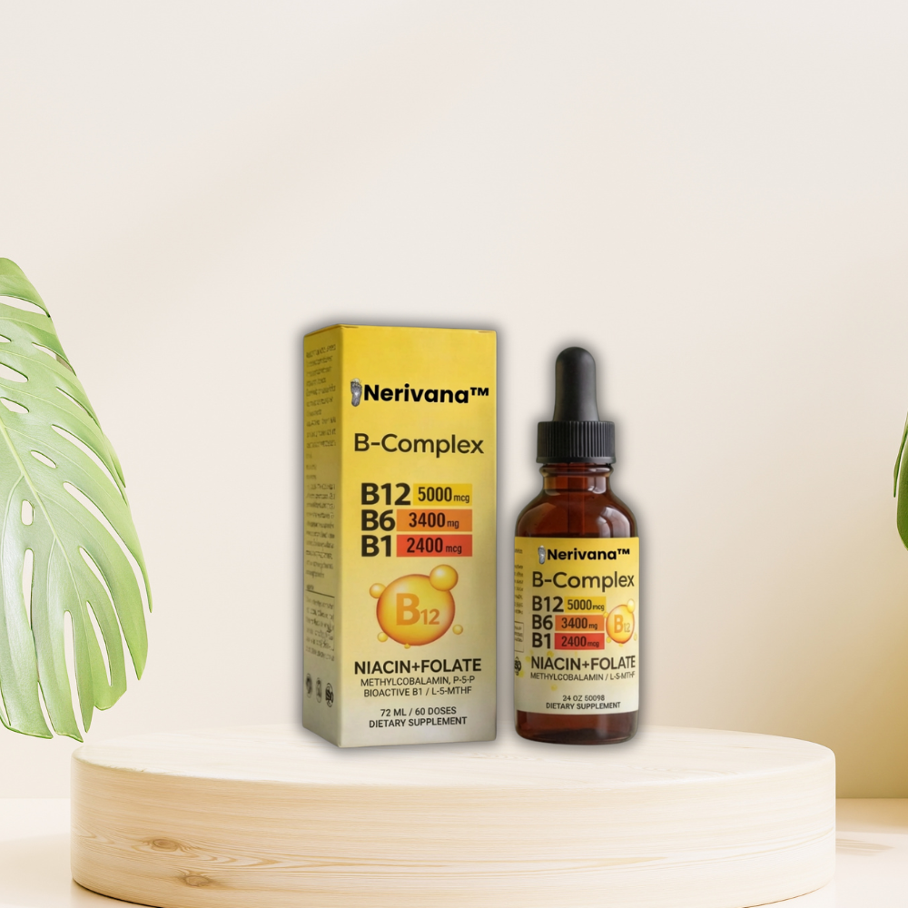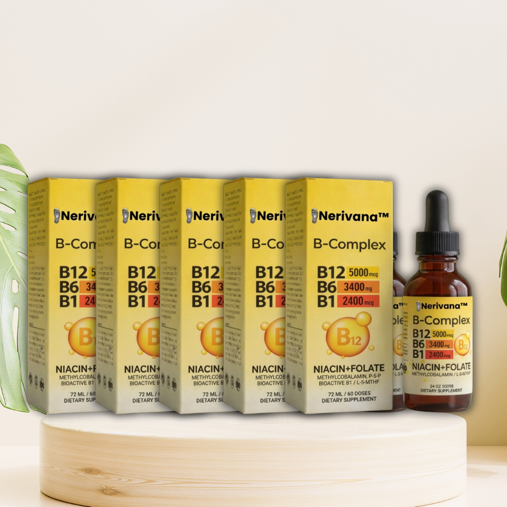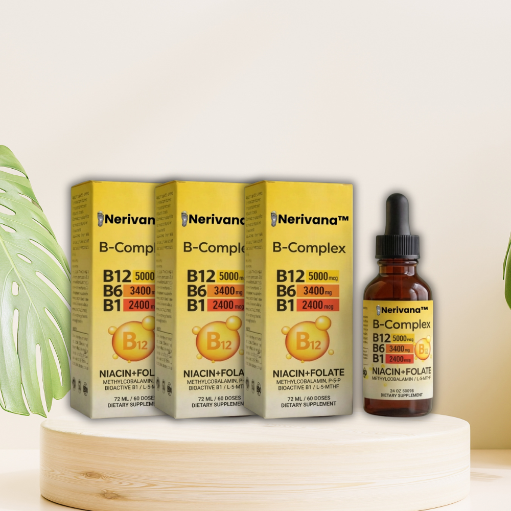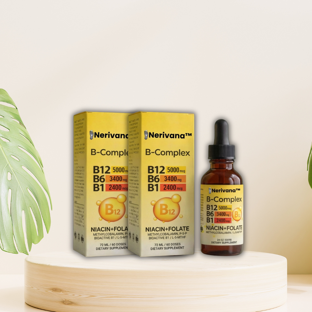 Nerivana™ B-Complex הוא תוסף תזונה נוזלי המכיל שילוב של ויטמיני B פעילים ביולוגית, כולל B12 (מתילקובלמין), B6 (P-5-P), B1, ניאצין וחומצה פולית (L-5-MTHF).
